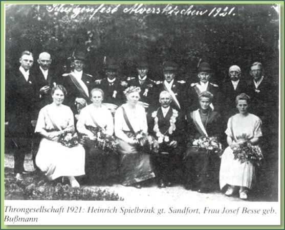 Es wurde dann in den Anlagen des Vorstandsmitgliedes Runde gefeiert und das Fest verlief in recht feuchtfröhlicher Stimmung. Der Champagner floss sehr reichlich. Malermeister Anton Wiesmann bildete mit Frau Anna Niehoff das Königspaar. Es war für eine lange Zeit das Fest, von dem die Alverskirchener sprachen. Diejenigen Schützen, welche die Flügel abschossen, waren die Flügelkönige. Sie gehörten automatisch zum Thron. Da zur damaligen Zeit der Schulunterricht bis 4 Uhr nachmittags dauerte, wusste die heimkehrende Schuljugend immer von den Flügelkönigen zu berichten. Der Königsschuss fiel, je nach Länge des Schießens, viel später. Die Flügelkönige im Jahre 1909 hießen Anton Walkenhaus und Anton Reifeld.