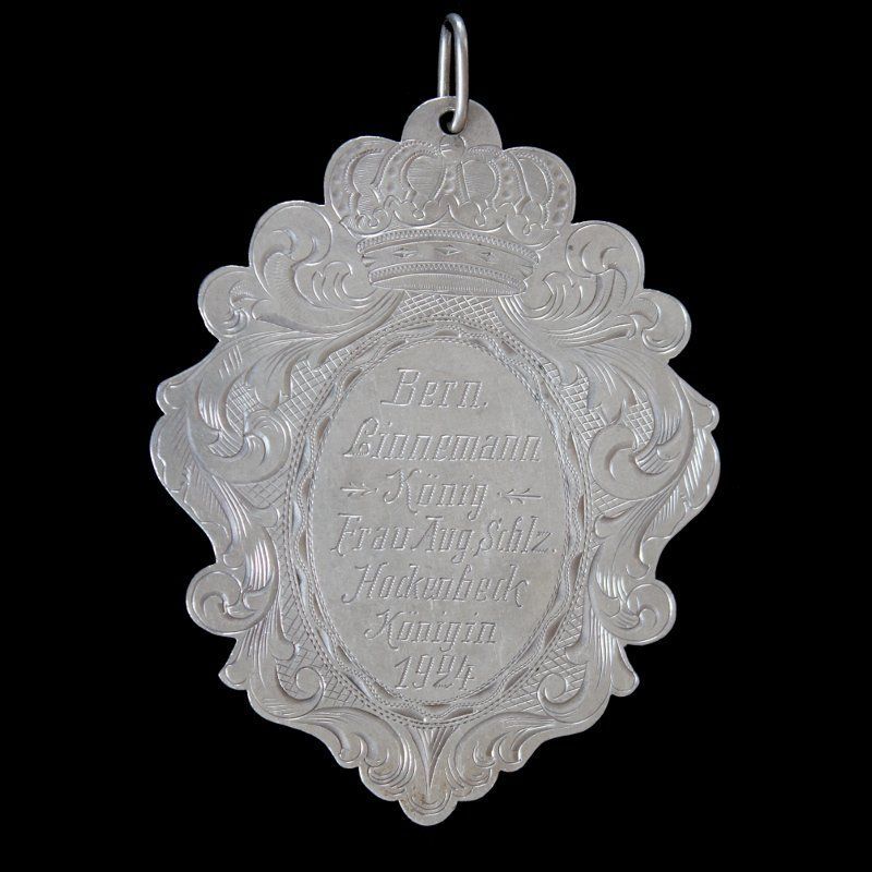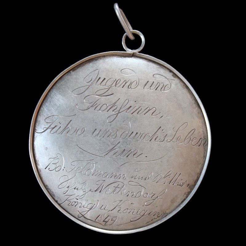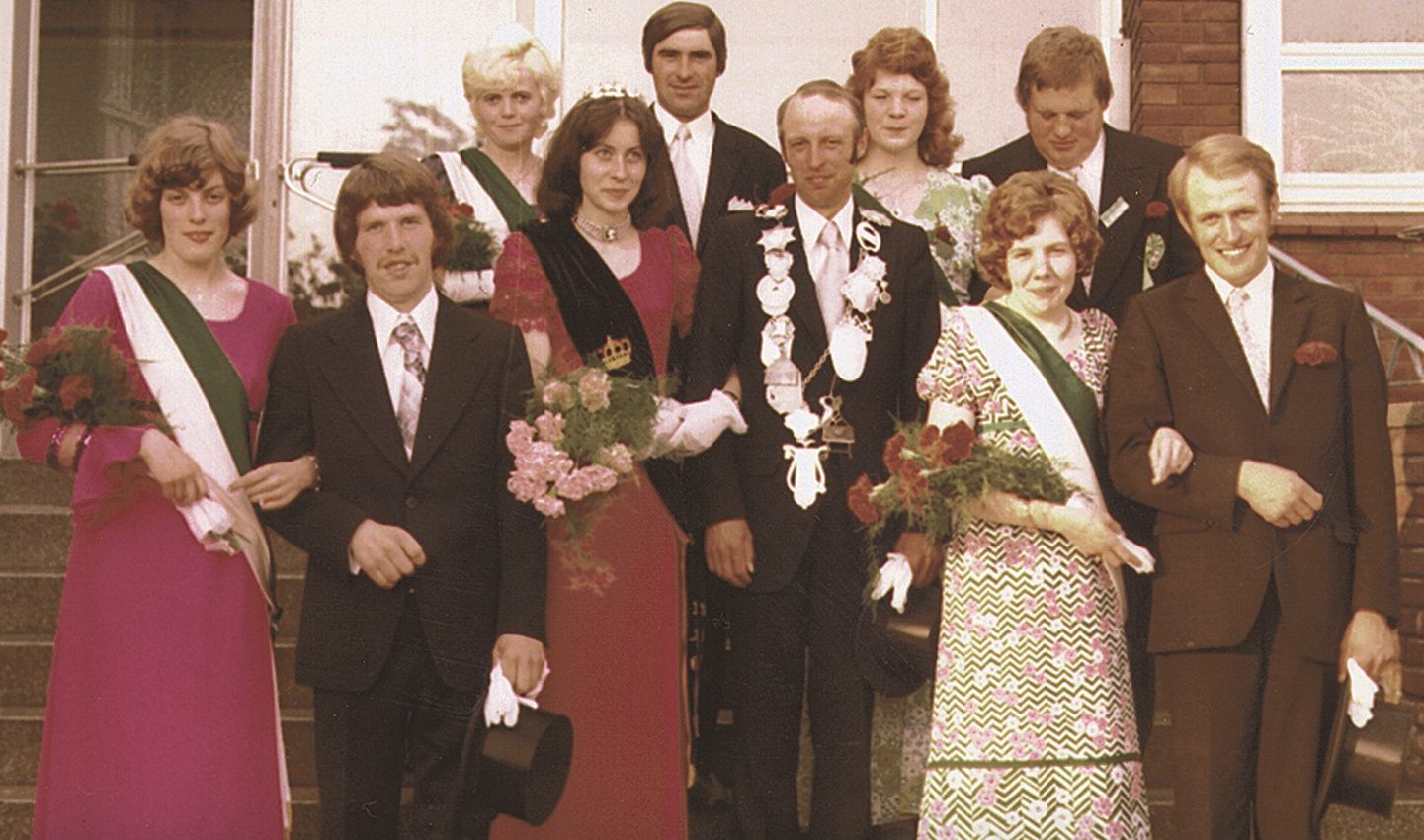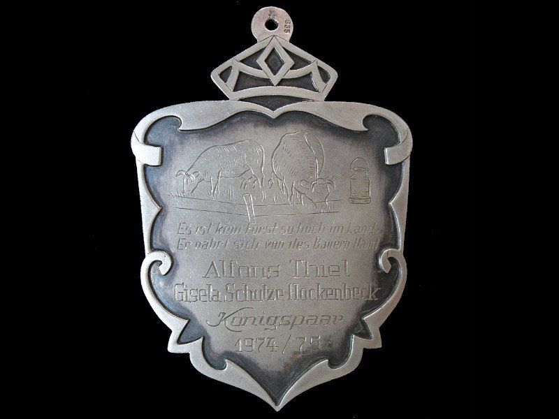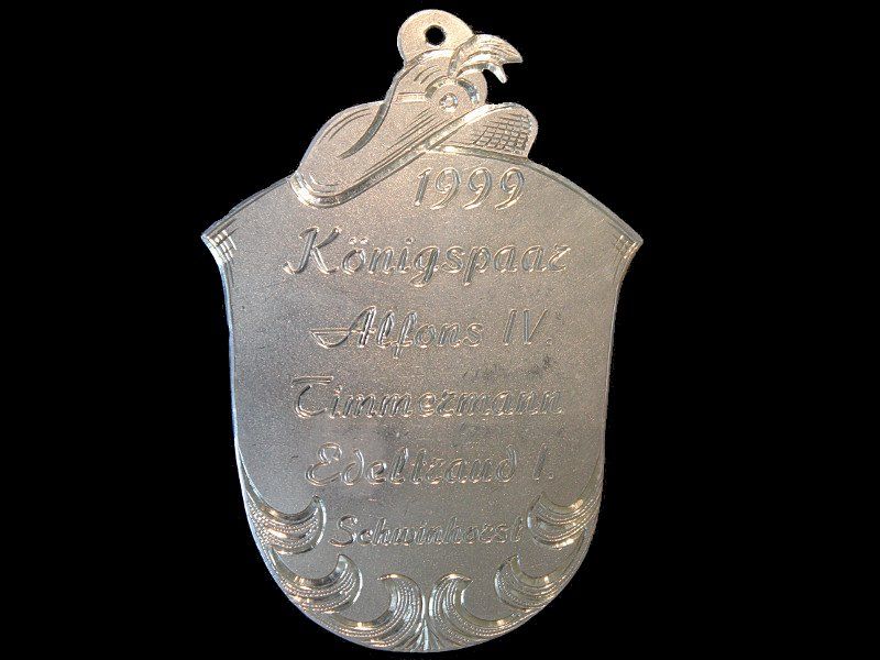 Vor 175 Jahren war dies gemäß noch im Vereinsarchiv befindlicher Königsplakette König Ed. Feldmann mit Königin Witwe Schulze Wettendorf, die seinerzeit unter dem Motto „Jugend und Frohsinn führe uns durchs Leben hin.“ regierten.