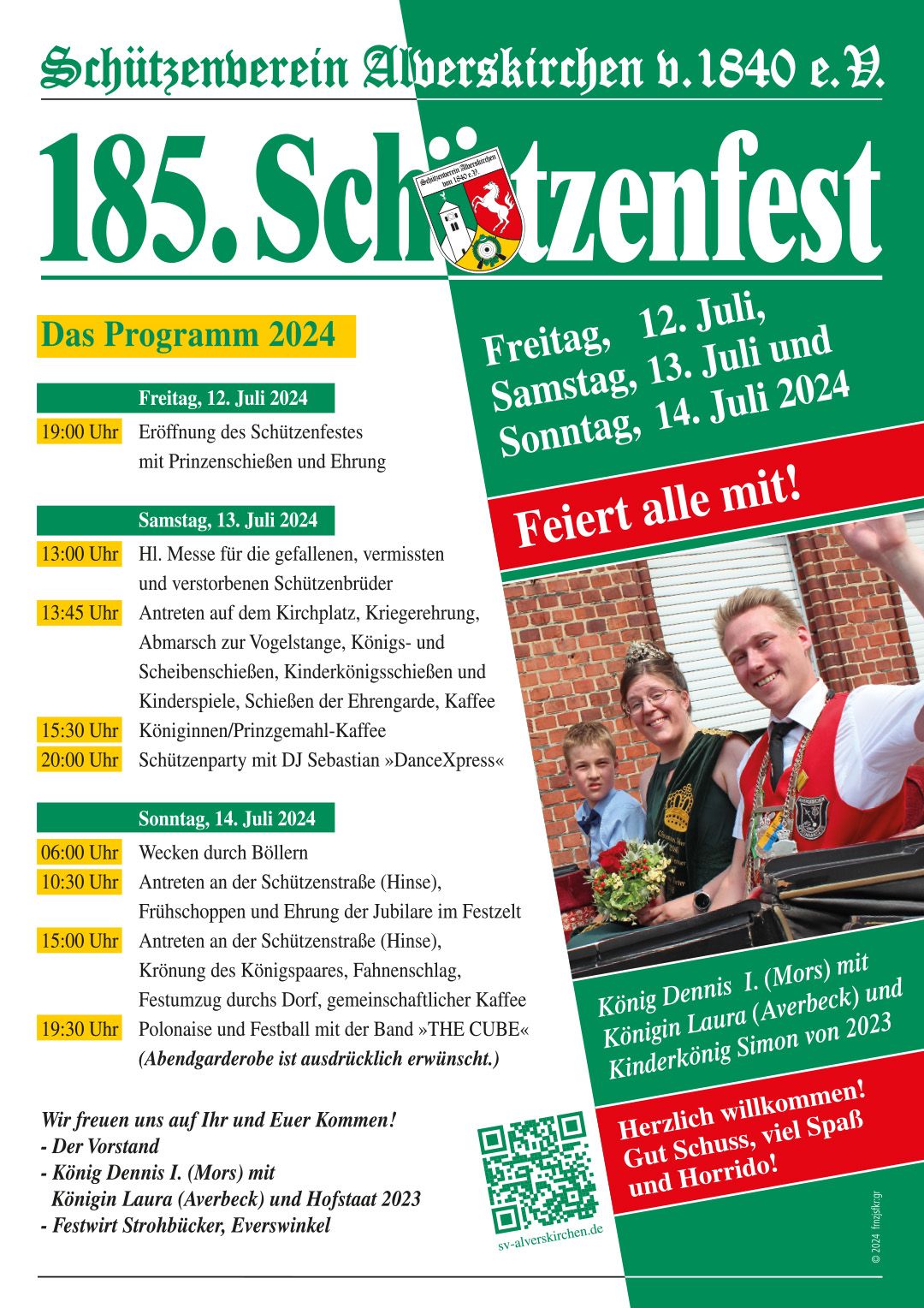 Die Vorfreude bei den Schützenschwestern und -brüdern in Alverskirchen steigt von Tag zu Tag. Ab dem 12. Juli ist in Alverskirchen wieder „etwas im Busch“. Pünktlich um 19.00 Uhr fällt an der Vogelstange auf dem Schützenplatz im Breiten Busch mit dem Holzschuhschießen der Startschuss zum bereits 185. Schützenfest des Schützenverein Alverskirchen von 1840 e.V..