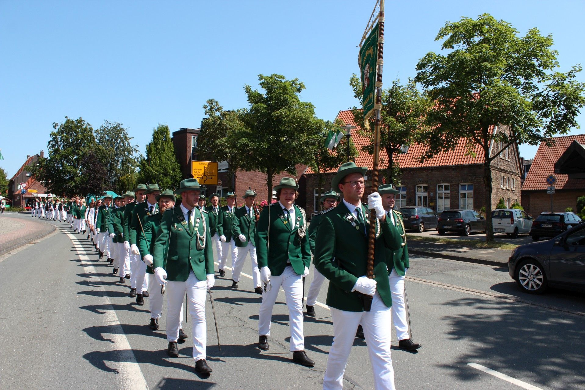 Die Zuschauer dürfen sich beim Antreten und dem folgenden Festumzug durch das Dorf auf einen imposanten und farbenfrohen Anblick freuen. Zu den zahlreichen Grünjacken - in diesem Jahr verstärkt von der neu gegründeten Kompanie der ehemals Aktiven -, der stets starken Gruppe der Schwarzjacken, dem Spielmannszug Alverskirchen in roter Uniform und dem Blasorchester Heimatland Greffen in grün-schwarzem Dress gesellt sich in diesem Jahr eine große Abordnung der Schützenbruderschaft St. Maria Magdalena Bruchhausen 1849 e.V., die mit ihren traditionell blauen Kappen, Schärpen und Krawatten farblich herausstechen werden. Begleitet werden sie von ihrem amtierenden Königpaar Dirk und Christina Wendel nebst Throngesellschaft sowie dem Spielmannszug „In Treue fest“ aus Hüsten.