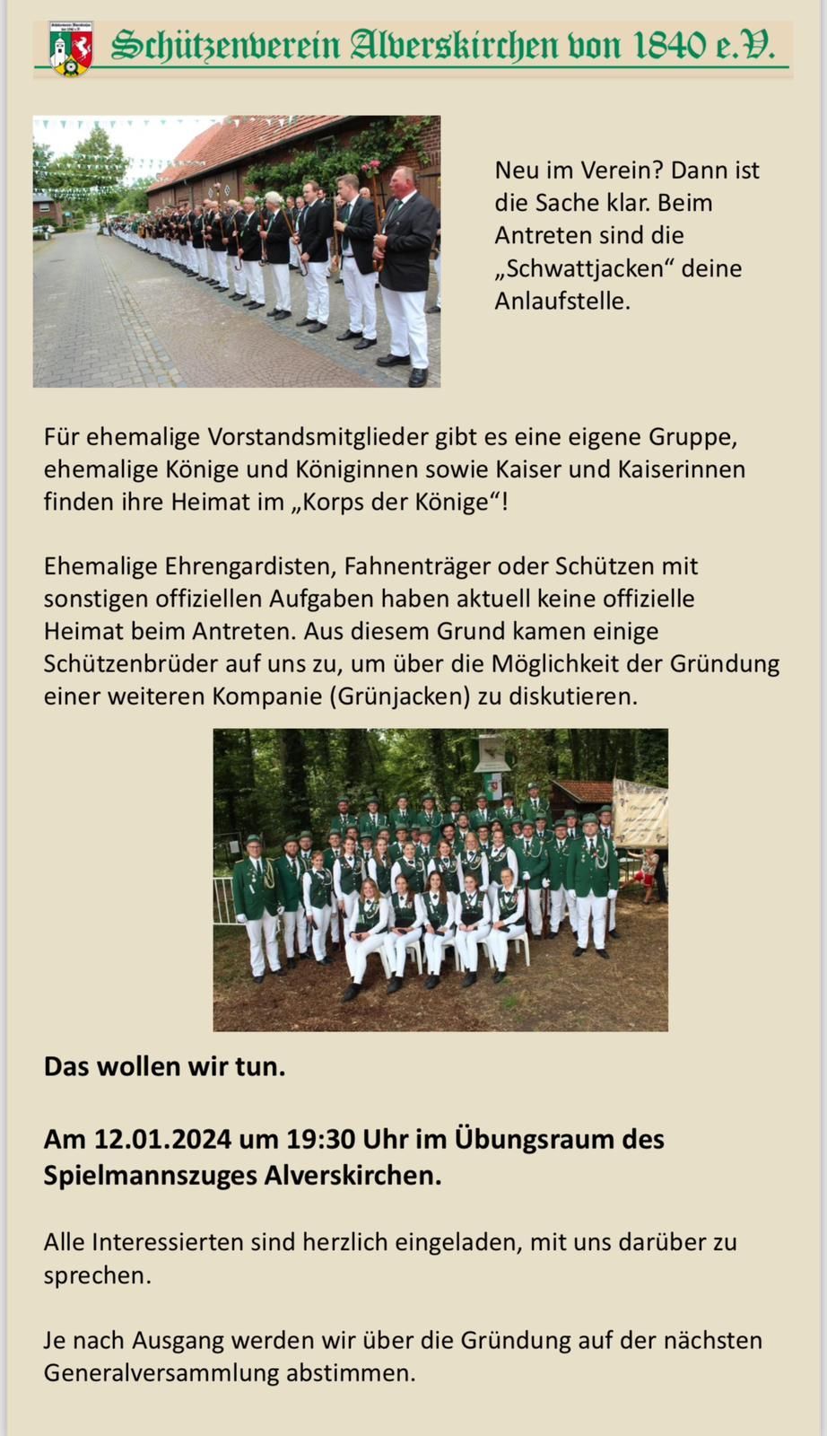 Der Vorschlag stieß im Vorstand auf breite Zustimmung, so dass man am Freitag, den 12 Januar 2024 alle ehemaligen Grünjacken zu 19.30 Uhr in den Übungsraum des Spielmannszuges einlädt. Hier soll die Idee einmal in größerer Runde vorgestellt und diskutiert werden. Zudem dient der Abend dazu auszuloten, ob die Idee auf ausreichendes Interesse trifft. Beschlossen würde die Gründung eines neuen, eigenständigen Korps dann ggfls. auf der Mitgliederversammlung am 16. März 2024.