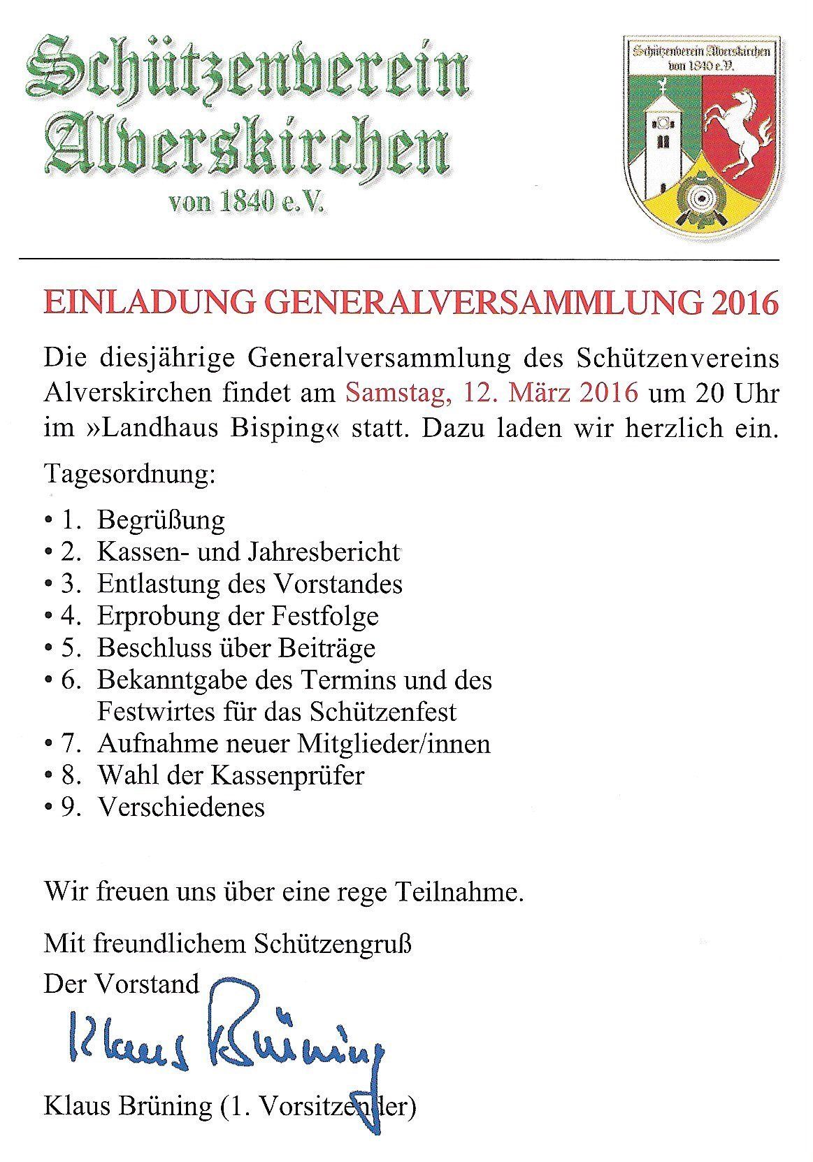 Der Schützenverein Alverskirchen von 1840 e.V. lädt seine Mitglieder herzlich zur diesjährigen Generalversammlung am Samstag, den 12. März 2016 um 20 Uhr in das Landhaus Bisping ein. Auf der Tagesordnung steht neben dem obligatorischen Kassen- und Jahresbericht, der Entlastung des Vorstandes und der Aufnahme der neuen Mitglieder in diesem Jahr auch ein Austausch über die Erprobung der im vergangenen Jahr geänderten Festfolge. Wahlen zum Vorstand finden in diesem Jahr turnusgemäß nicht statt. Nach dem offiziellen Teil der Generalversammlung besteht die Möglichkeit, das vergangene Schützenjahr noch einmal in geselliger Runde Revue passieren zu lassen. Hierzu werden per Beamer ausgewählte Bilder des vergangenen Jahres gezeigt.