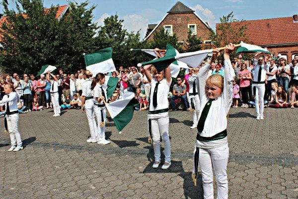 Für die übrigen Schützen beginnt der Tag mit dem Hochamt um 9.30 Uhr, dass anlässlich des Jubiläums in diesem Jahr im Pfarrgarten gefeiert wird. Nach dem Gottesdienst erfolgt im Gedenken der verstorbenen und gefallenen Schützenbrüder die Kranzniederlegung am Mahnmal auf dem Kirchplatz. Gottfried Freiherr von Twickel wird hierbei die Gedenkworte sprechen. Beim anschließenden Frühschoppen, in dessen Mittelpunkt die Ehrung langjähriger Mitglieder steht, wird auch in diesem Jahr zunächst Freibier ausgeschenkt. Der Höhepunkt des Festes steht um 15 Uhr auf dem Programm. Nach dem Antreten an der Schützenstraße wird das neue Königspaar in die Formation aufgenommen und zur Krönung auf den Kirchplatz geleitet. Auf den Fahnenschlag zu Ehren der neuen Majestäten kann das Schützenvolk schon gespannt sein. Die jungen Fahnenschläger um Lena Kemker und Katharina Vages haben schon seit Ostern fleißig an ihrer neuen Darbietung gefeilt. Mit einem Umzug durch das Dorf zum gemeinschaftlichen Kaffeetrinken im Festzelt endet das Nachmittagsprogramm. Nach einer kurzen Pause werden die Schützen festlich gekleidet zur Polonaise um 19.30 Uhr erwartet. Beim abschließenden Königsball mit der Band "Jet-Five" im Festzelt ist Abendgarderobe ausdrücklich erwünscht.