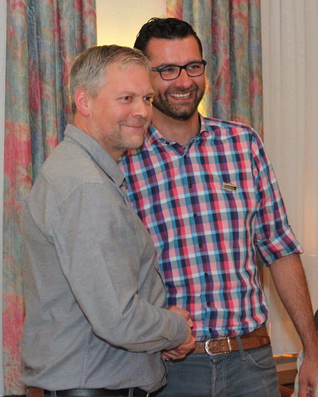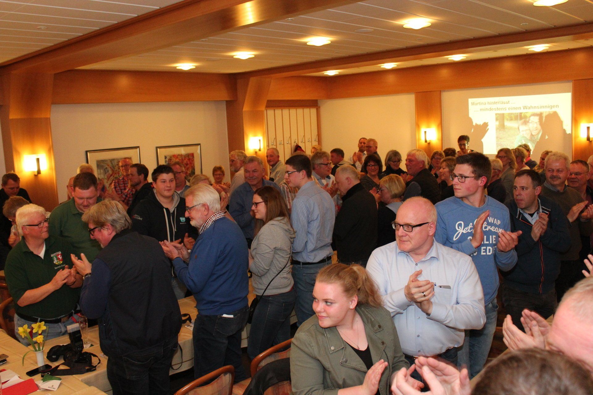 Mit den Worten „Es war eine schöne und bewegende Zeit“, leitete Brüning seine eigenen Abschiedsworte als Vorsitzender ein. Brüning gehörte seit dem Jahr 2001 dem Vorstand an und übernahm im Jahr 2011 die Funktion des 1. Vorsitzenden. „Ich habe gerne mit den Vorstandsmitgliedern zusammengearbeitet, und wir haben nicht nur gute Arbeit geleistet, sondern auch ganz viel miteinander gelacht“, lautete sein Resümee. „Dafür möchte ich mich herzlich bedanken.“ Mark Hansel als frisch gewählter neuer Vorsitzender sprach von großen Fußstapfen, die Brüning hinterlassen habe. „Deine Art zu reden und die Leute zu begeistern, ist einfach fantastisch, und Du hast den Verein hervorragend durch die Jahre der Jubiläumsfeierlichkeiten geführt.“ Als Erinnerung an seine Vorstandszeit bekam Brüning aus den Händen seines Nachfolgers ein Fotobuch. Auch zu Brünings Ehren erhob sich die Versammlung und spendete lang anhaltenden Beifall.