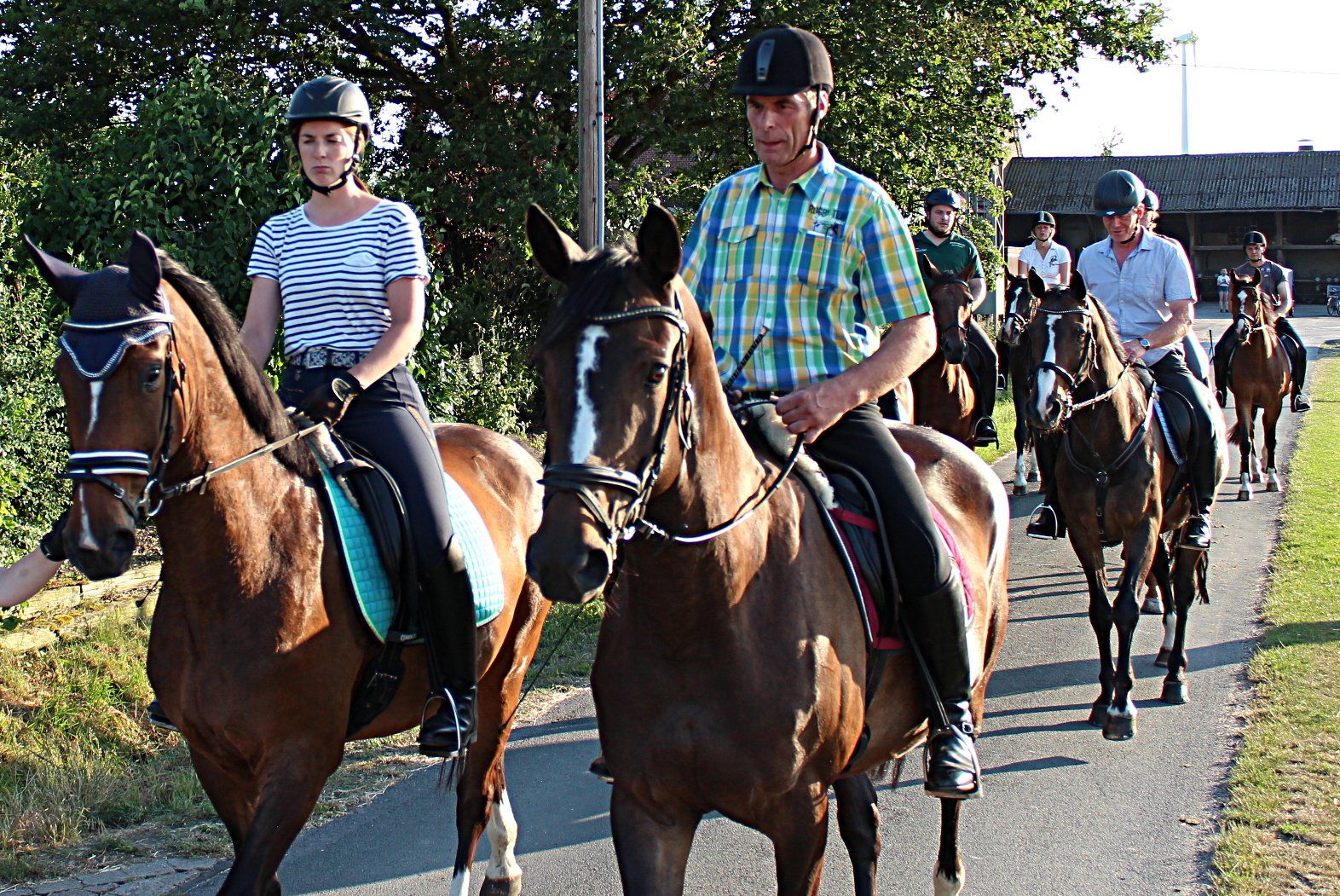 Seit Wochen bereiten sich die aktiven Schützen in beiden Orten an zahlreichen Übungsabenden wieder auf das Fest der Feste vor. Doch nicht nur die Schützen müssen hierauf bestens vorbereitet sein, auch die Reitpferde müssen wieder an die anspruchsvolle Aufgabe „Schützenfest“ herangeführt werden. Laute Musik, zahlreichen Schützen und Zuschauer, wehende Fahnen und Standarten sowie das ungewohnte Marschtempo verlangen den Pferden während der Festtage einiges ab. Damit sie beim Schützenfest gelassen reagieren und ihrem Reiter vertrauen, stehen für Reiter und Pferd auch einige Übungsstunden an. Eine willkommene Gelegenheit, die Schützenfestatmosphäre möglichst realitätsnah zu trainieren, bildet schon traditionell der gemeinsame Übungsabend der Ehrengarde des Schützenverein Alverskirchen von 1840 e.V. zusammen mit dem Spielmannszug Alverskirchen und den berittenen Offizieren des Vereins. Seit 2008 nehmen auch die berittenen Offiziere des benachbarten Bürgerschützen- und Heimatvereins St. Hubertus Everswinkel e.V. hieran teil – der Austragungsort wechselt seit dem von Jahr zu Jahr zwischen Alverskirchen und Everswinkel. Am vergangenen Mittwoch traf man sich auf dem Hof des Everswinkeler Oberst Walter Buntenkötter in der Bauerschaft Wester. Nach der ausgiebigen Übungseinheit ließen sich die Schützen ein kühles Getränk und die Bratwurst vom Grill schmecken.
