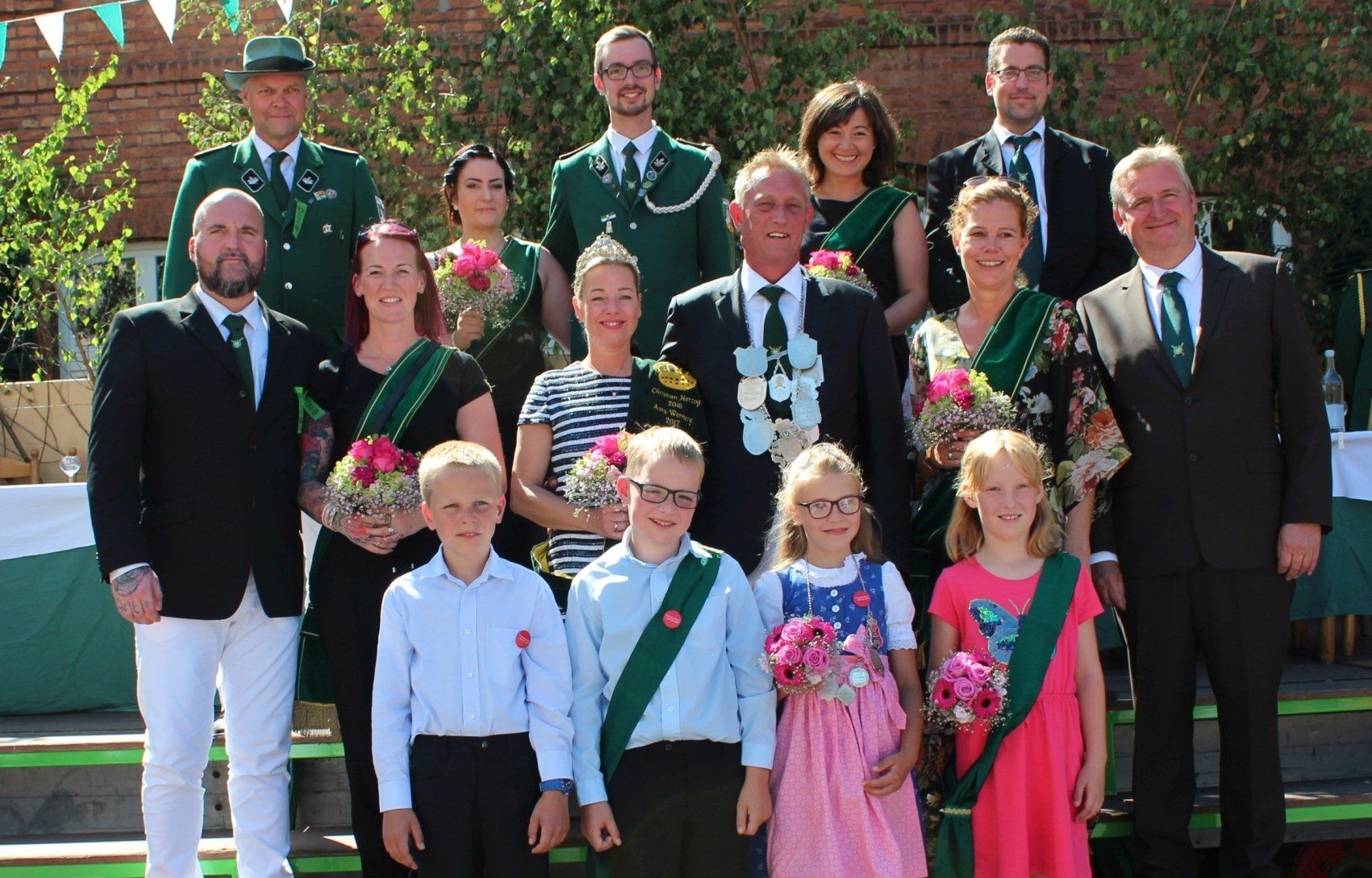 Am Nachmittag strahlten die alten Majestäten und die frisch gekrönten Majestäten auf dem Kirchplatz um die Wette. Zahlreiche Zuschauer verfolgten bei der feierlichen Krönungszeremonie die Amts- und Abzeichenübergabe von dem scheidenden König Klaus Peter auf Marco Leivermann bei den Erwachsenen sowie von Johanna von Twickel auf Jana Leivermann bei den Kindern.