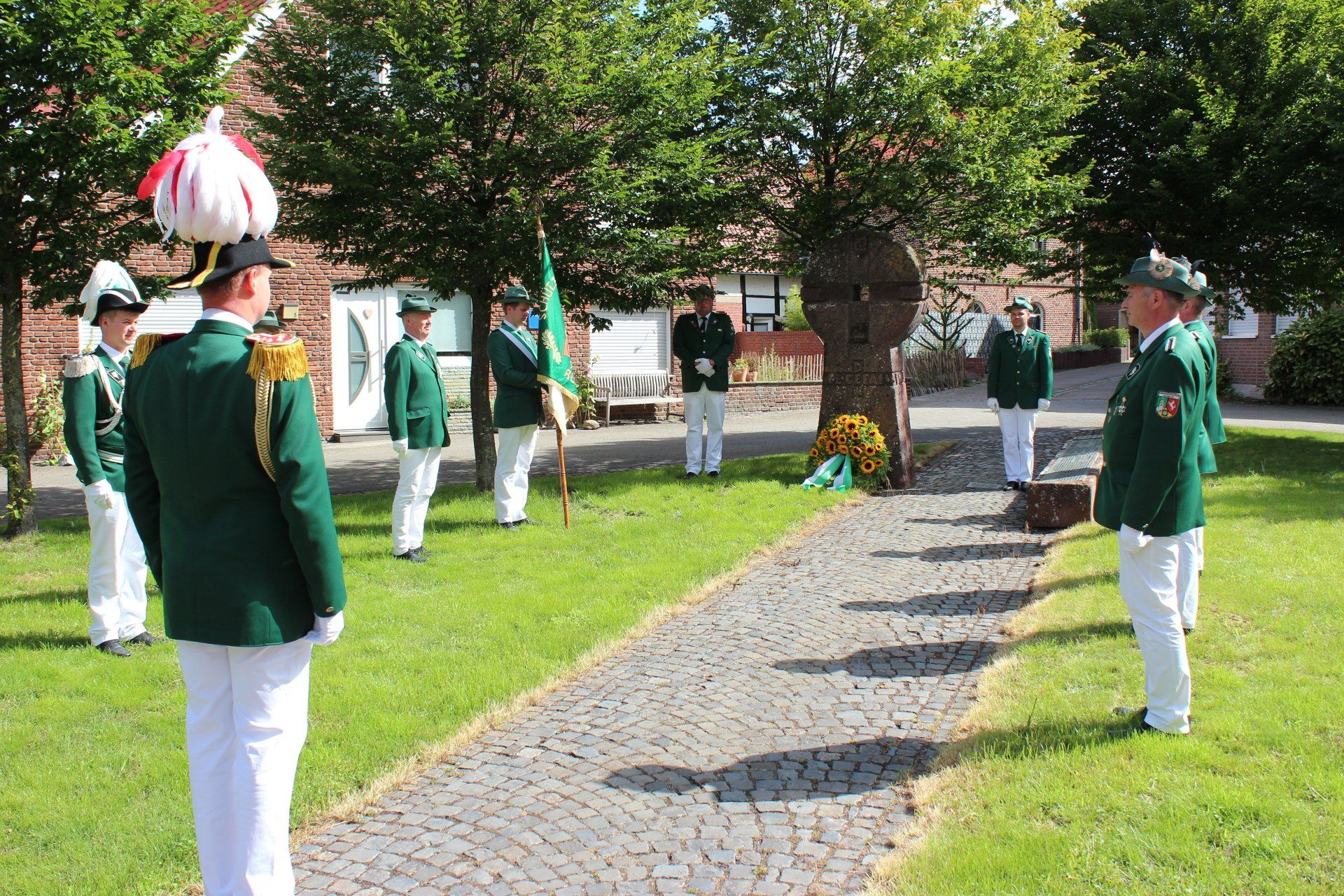Am Sonntagmorgen hielten Vorstand und Throngesellschaft im Anschluss an die heilige Messe die Tradition des Gedenkens an die Opfer der vergangenen Kriege mit der Kranzniederlegung am Kriegerdenkmal in Ehren. Der erste Vorsitzende des Vereins Mark Hansel stellte in seiner Gedenkrede die Frage „Ist es eigentlich noch zeitgemäß, jedes Jahr hier Halt zu machen und einen Kranz niederzulegen?“. „Eindeutig ja“, konnte man als Fazit seiner Worte festhalten. Schließlich sei das Ehrenmal auch ein Mahnmal. „Es mahnt, dass politische und gesellschaftliche Bestrebungen hin zu Frieden und Versöhnung umgesetzt werden müssen und dass es in unserer Gesellschaft keinen Platz mehr geben darf für Extremismus und Gewaltverherrlichung.“, so Hansel. Dies liege in der Verantwortung eines jeden Einzelnen. Er schloss mit einem treffenden Zitat von Martin Luther: „Unser Nächster ist jeder Mensch, besonders der, der unsere Hilfe braucht.“.