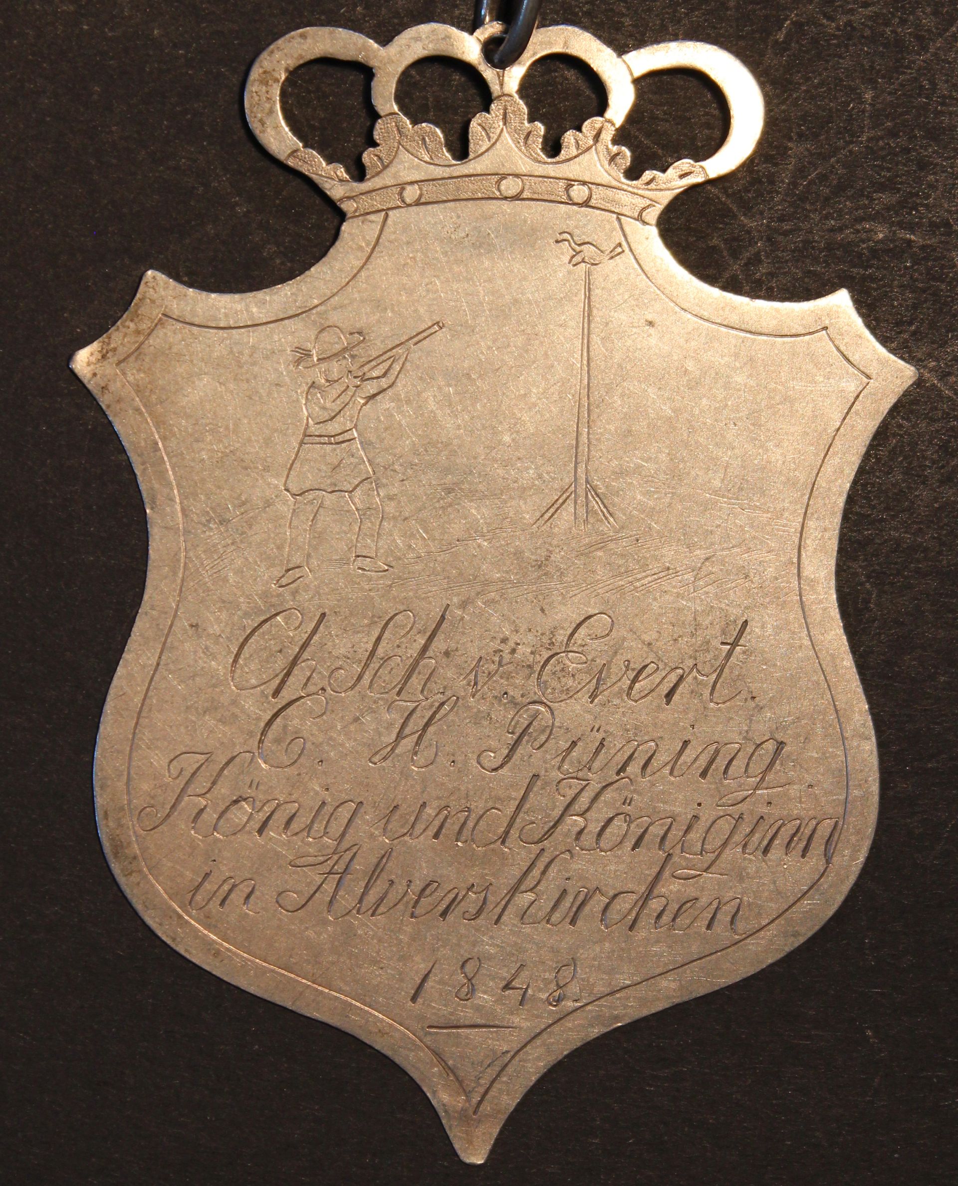 Bei einer solch langen Tradition lohnt sich auch immer ein Blick zurück in die Vereinshistorie. So wird zum Beispiel im Rahmen des Frühshoppen am Schützenfestsonntag den Königen mit Jubiläum besonders gedacht. Vor 175 Jahren war dies gemäß noch im Vereinsarchiv befindlicher Königsplakette Ch. Sch. V. Evert, der seinerzeit zusammen mit seiner Königin C. H. Püning regierte.