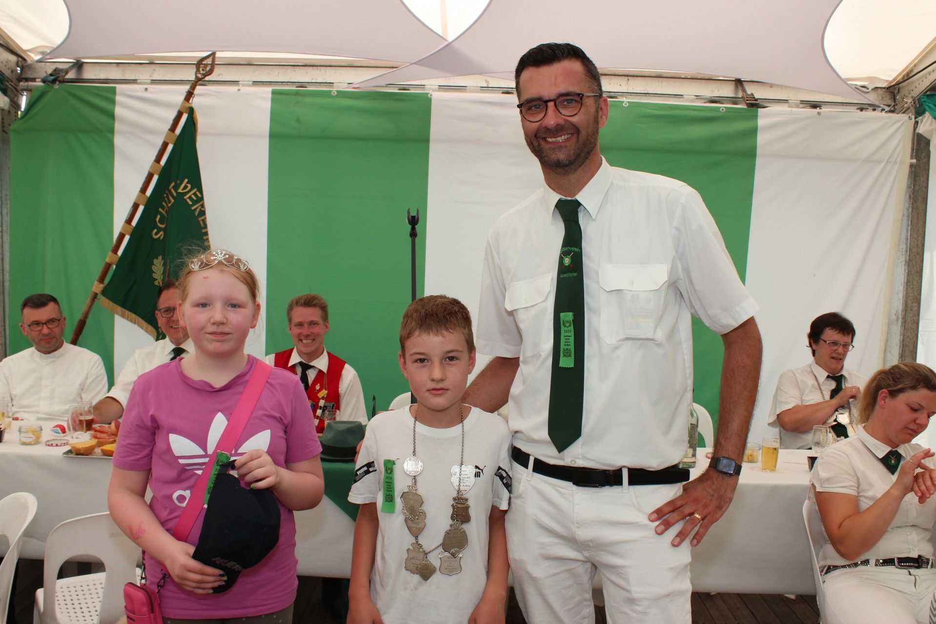 Der Kindervogel fiel bereits gut zwei Stunden eher. Hier konnte sich Simon Leivermann gegen seine zahlreichen Konkurrenten durchsetzen. Zur Königin wählte er Abbey Jagusch, das Kinderthronpaar bilden Moritz Kerkhoff und Isabell Hesse.