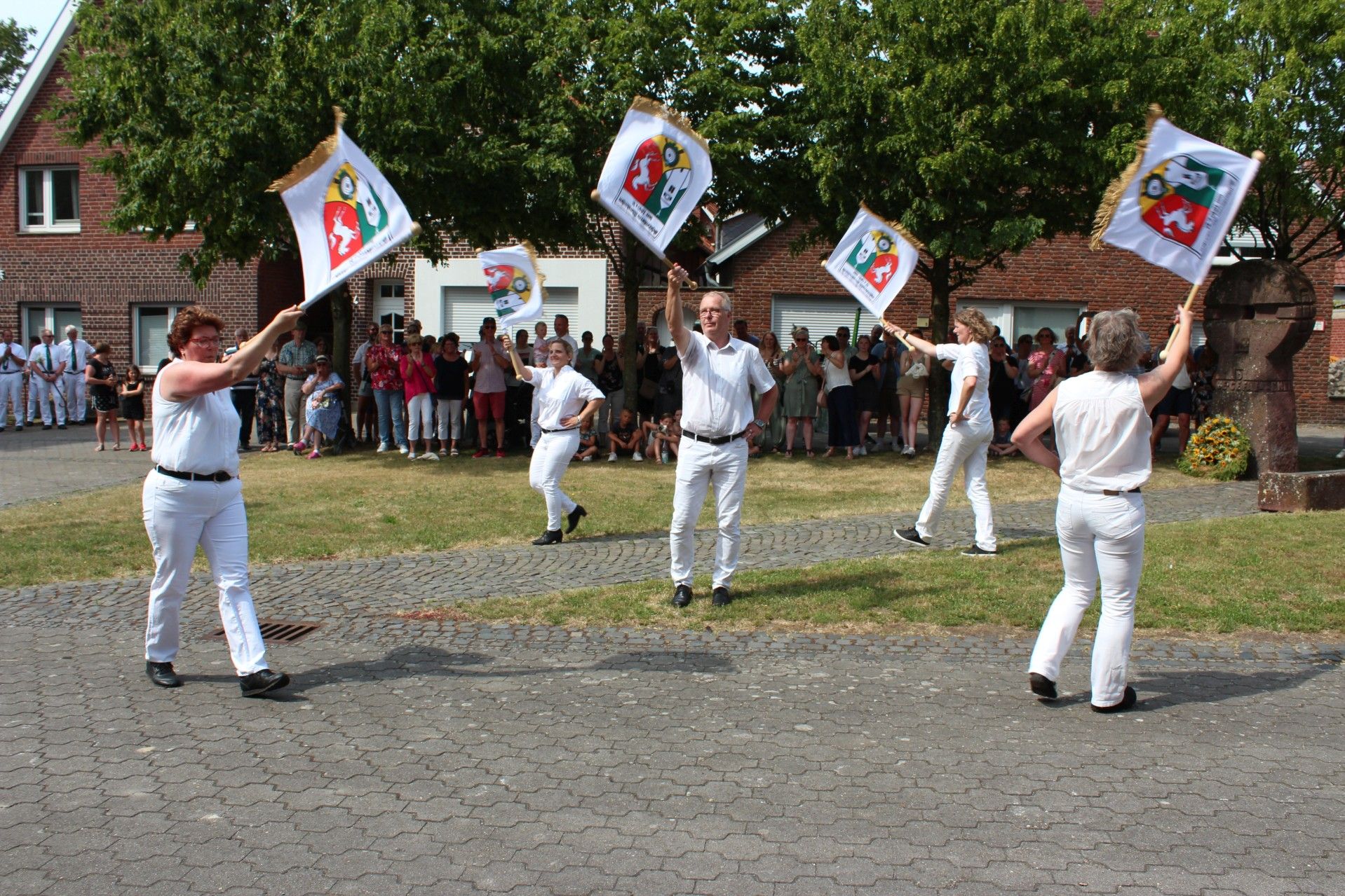 In seiner originellen und mit viel Wortwitz gespickten Thronrede stellte der Vorsitzende des Vereins, Mark Hansel, die Throngesellschaft vor. Dabei ging er nicht nur auf Beruf und Hobbies ein, sondern wusste auch von vielen lustige Begebenheiten im Leben der Majestäten und ihres Hofstaates zur berichten. Die Fahnenschlaggruppe - auch auf Grund der Ferienfreizeit besetzt mit ehemaligen Fahnenschlägern - zeigte anschließend einen tollen Auftritt nebst Zugabe.