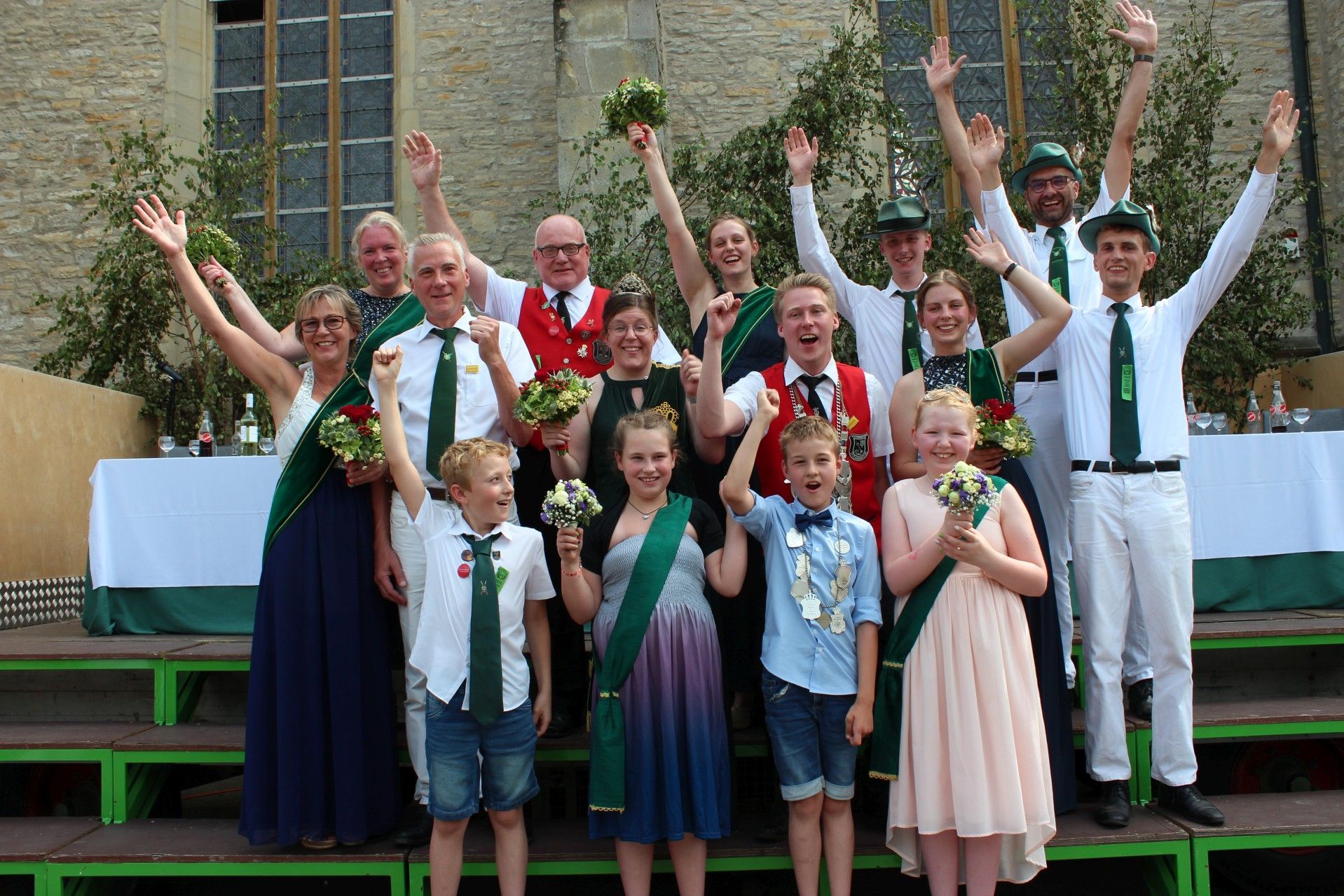 Am Nachmittag strahlten die alten Majestäten und die frisch gekrönten Majestäten auf dem Kirchplatz um die Wette. Zahlreiche Zuschauer verfolgten bei der feierlichen Krönungszeremonie die Amts- und Abzeichenübergabe von der scheidenden Kaiserin Martina Samberg auf Dennis Mors bei den Erwachsenen sowie von Justus Pellmann auf Simon Leivermann bei den Kindern.